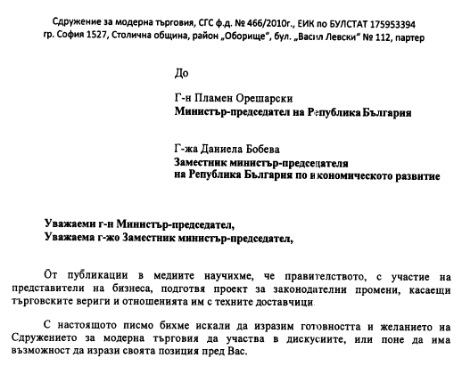 Тук е мястото да кажем, че Сдружението за модерна търговия е изразявало (и формално, и неформално до правителството, различни представители на властта и бизнеса) готовност и желание да се включи в този диалог, за да се търси решение на реалните, а не на несъществуващи проблеми. Ето част от нашето писмо, изпратено на 8 август, на което все още нямаме отговор: